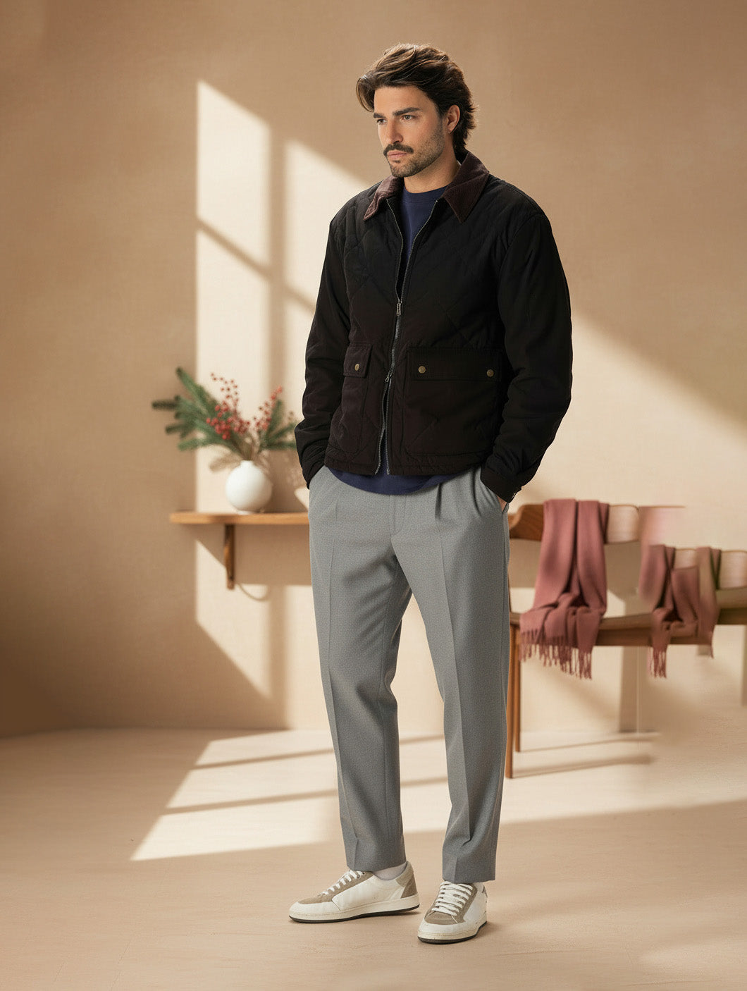 - Cuello de terciopelo acanalado en contraste - Cierre frontal con cremallera de doble cursor...